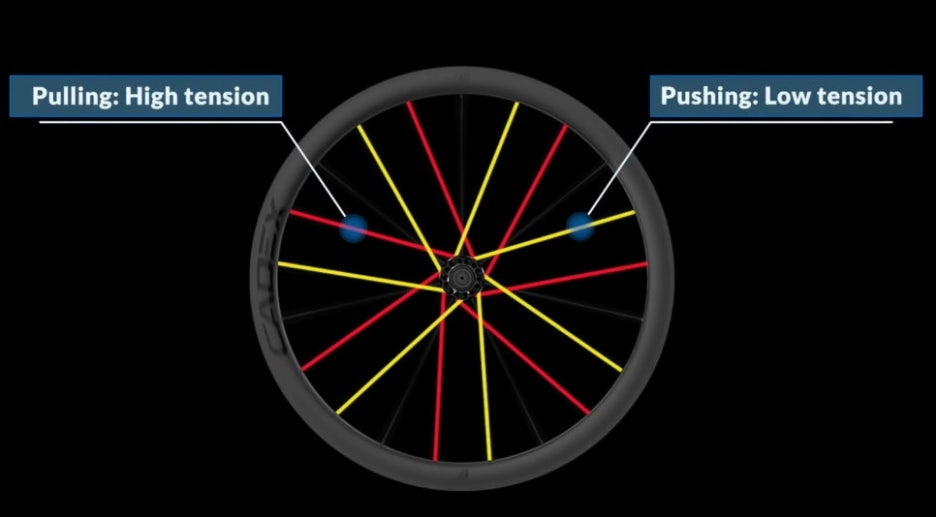 기존의 휠은 페달링 중에 빨간 스포크는 긴장되고, 노란 스포크는 느슨해지며 텐션 차이가 발생합니다. 이로 인해 구동 효율과 강성이 떨어지는 문제가 생깁니다.