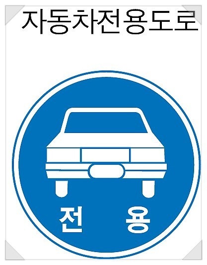 자동차전용도로 시작 표시. 파란 바탕에 자동차 모양에 보이면 자전거는 절대 진입해선 안된다! 시, 도 마다 약간의 모양이 다르다. 글자가 없는 경우도 있다.