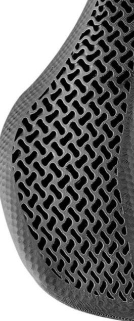 AMP 3D의 가장 눈에 띄는 부분은 ‘자이로이드(gyroid) 인필’이라는 3D 프린트 패딩 구조입니다. 예전 3D printed 안장들이 육각 벌집(hexagon) 구조 등을 사용한 것과 달리, CADEX는 “교차하는 2D 물결모양 패턴”을 적용했습니다.