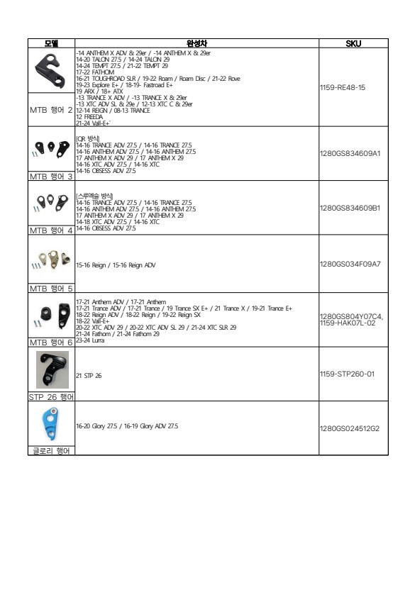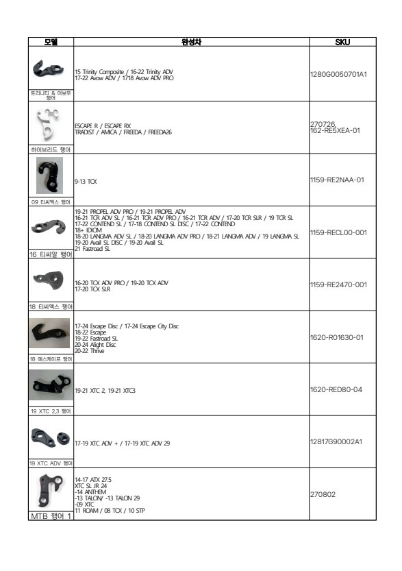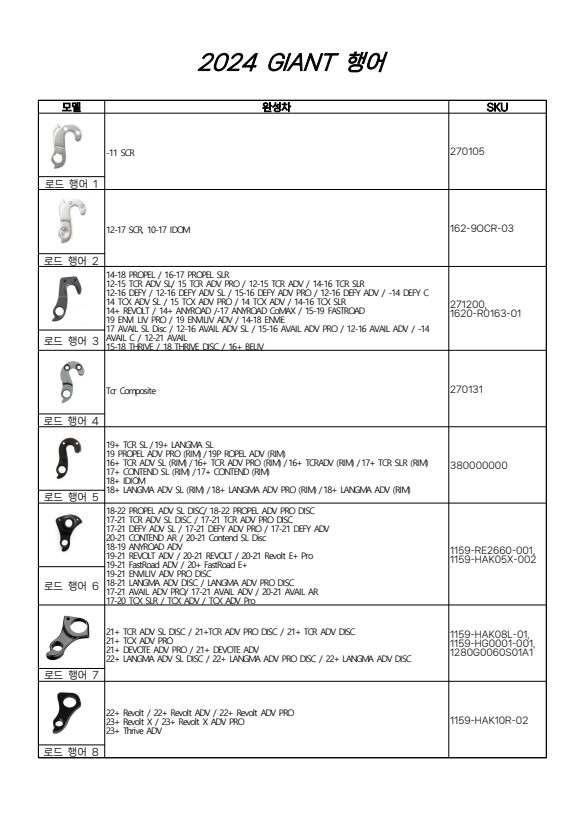 그래서 이번 포스팅에서는 자이언트 자전거 모델별 뒷변속기 행어 차트를 정리해봤습니다.