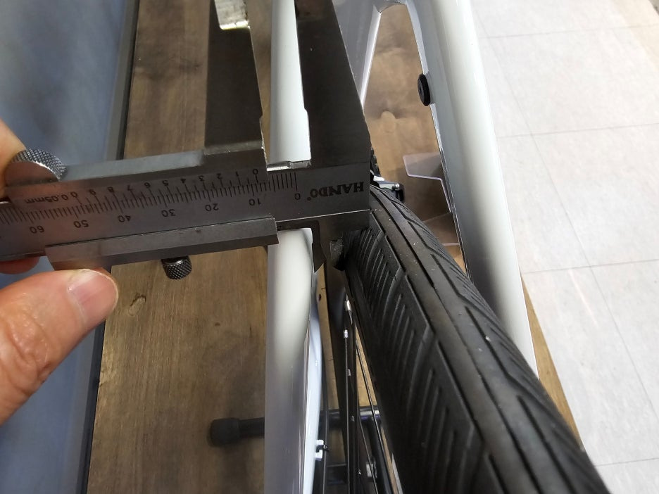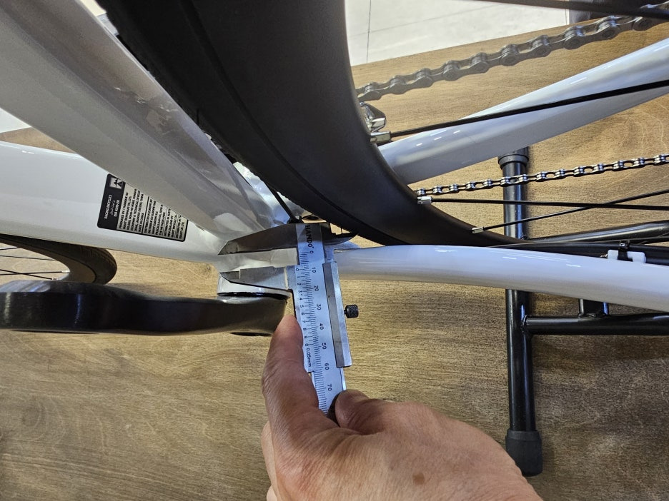 2) 다음 두 위치의 프레임과 타이어 사이 간격을 자나 캘리퍼스로 측정합니다.