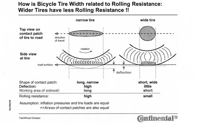 이건 좀 의외일 수 있지만, 실험 결과 동일한 공기압일 때 넓은 타이어의 구름 저항이 더 낮을 수 있습니다.